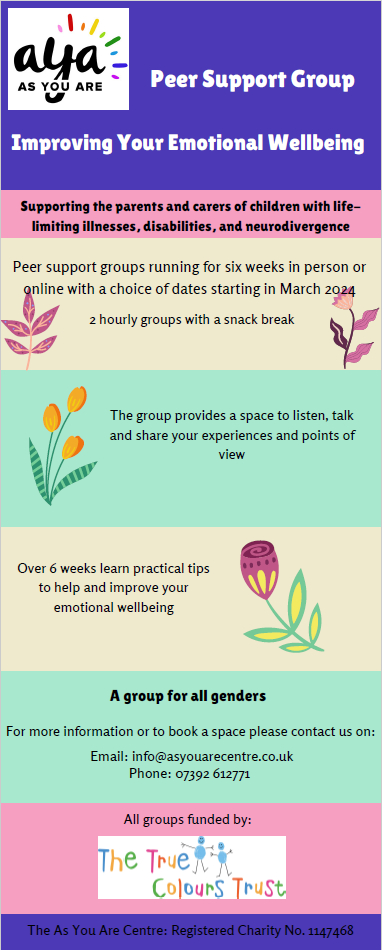 There are four groups being held across different dates & different locations by As You Are for parents/ carers of children with neurodivergence, disabilites or life-limiting illness. I am co-running a group from March 16th.